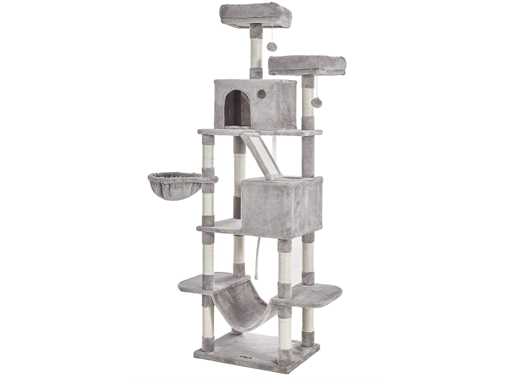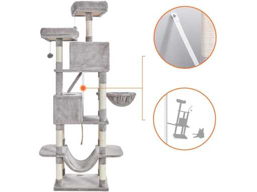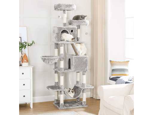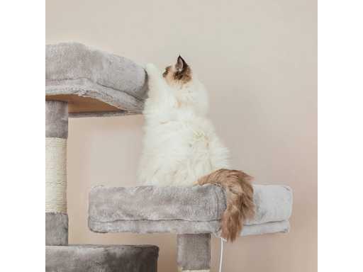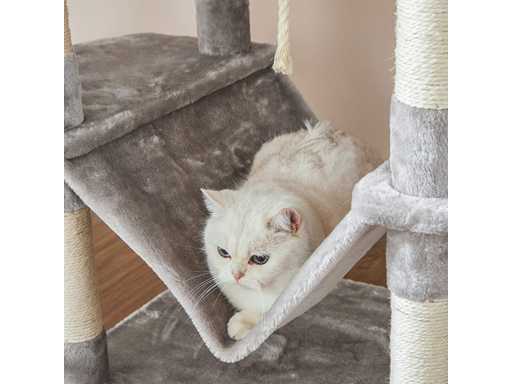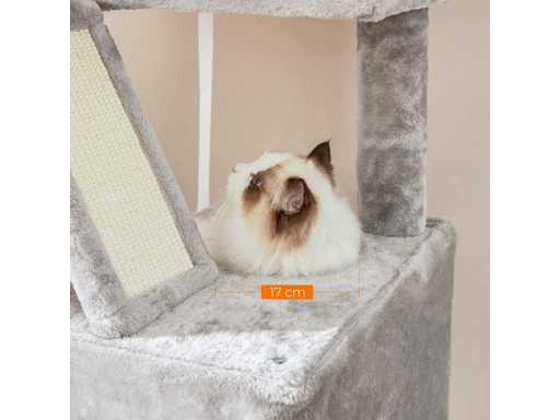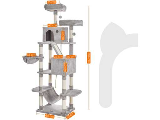 Kenmerken: Kleur: Lichtgrijs Materialen: Spaanplaat, zachte stof, sisal Afmetingen: 60 x 50 x 206 cm (L x B x H) Gewicht: 26,4 kg Bezorging: 1 x Krabtaam 1 x Montagekit 1 x Anti-tip apparaat