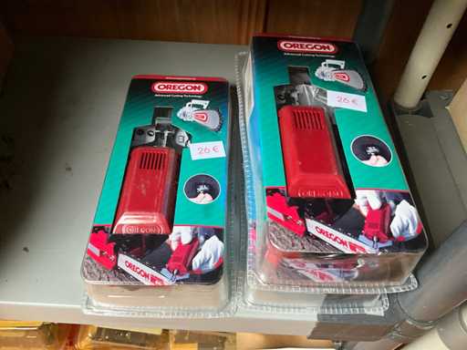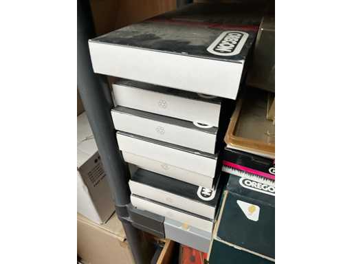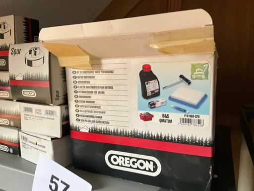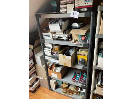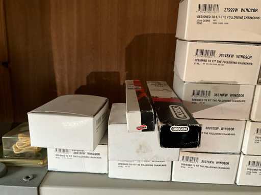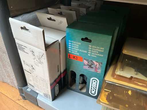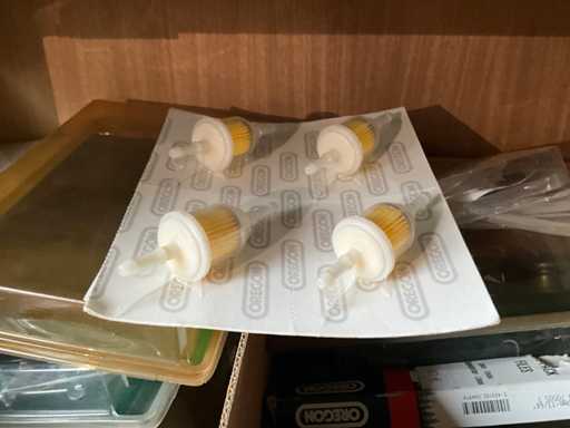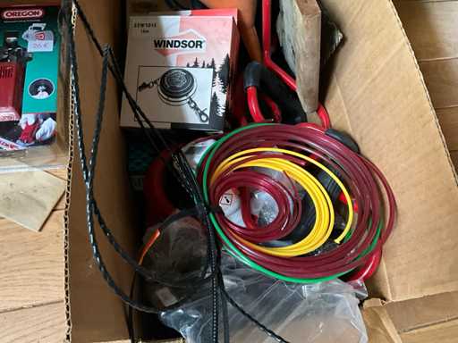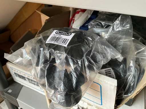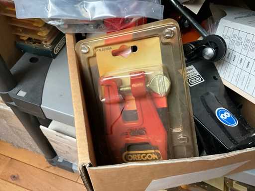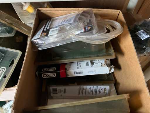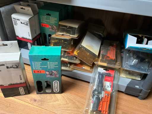 Grote partij diverse accesoires voor kettingzaag en bosmaaier waaronder diverse filters, diverse kabels, diverse maaikoppen en maaikopdraad, kettinzaagvijlen, geleidercorrecties, elektrische zaagbladslijpers, afgifte volgens aanwijzing