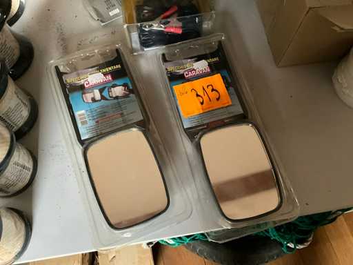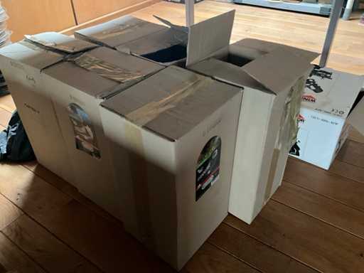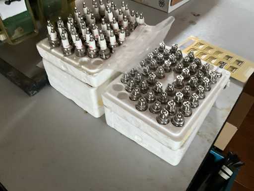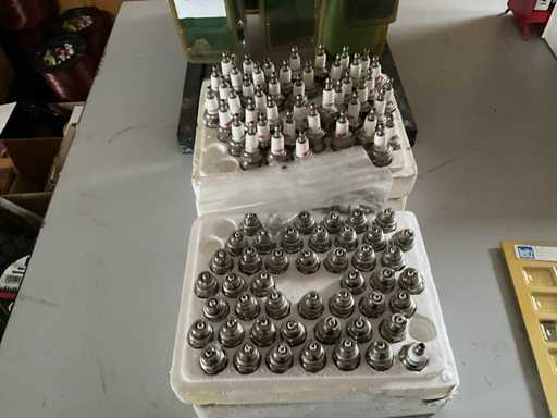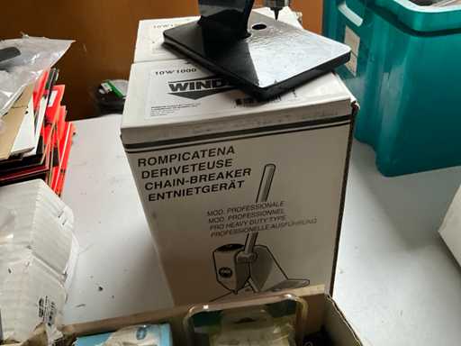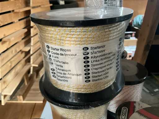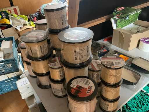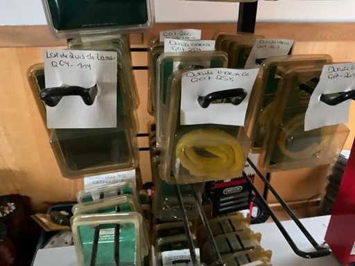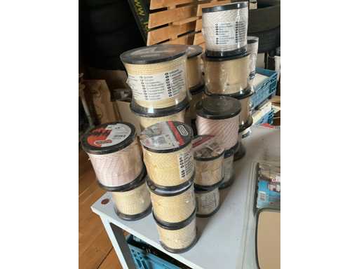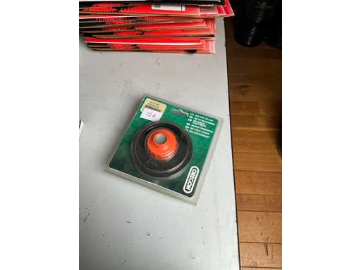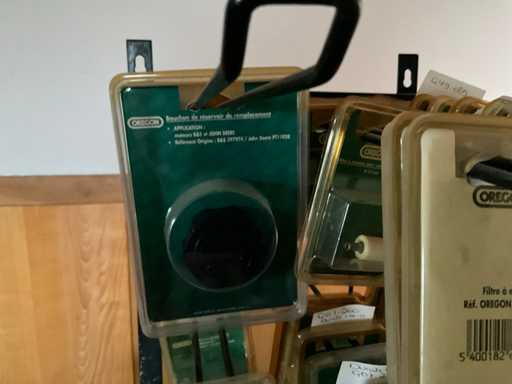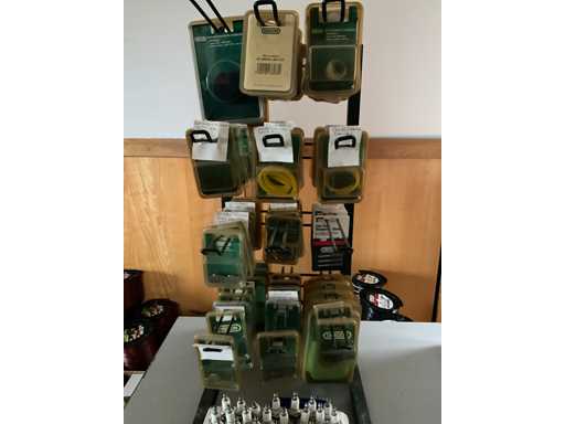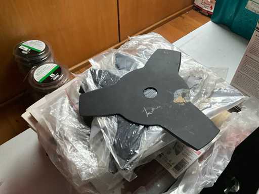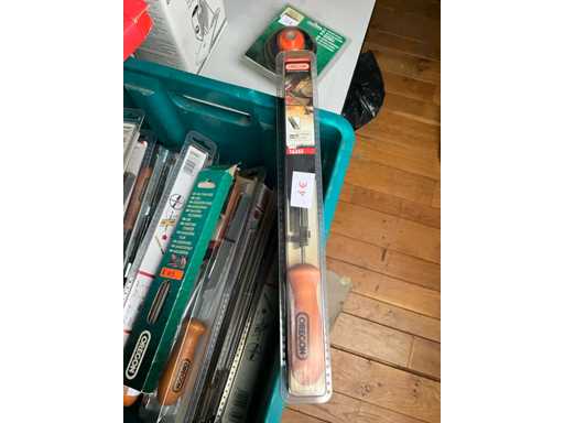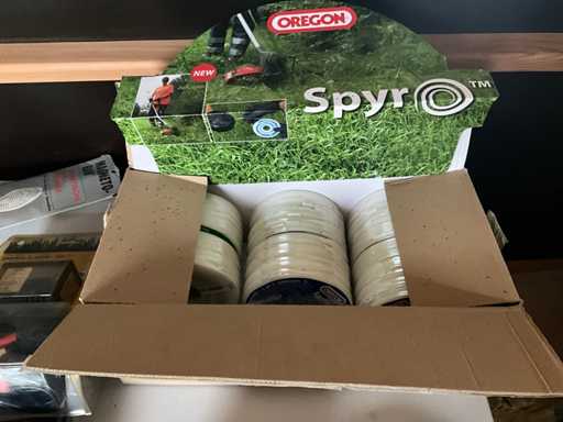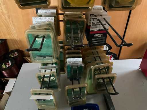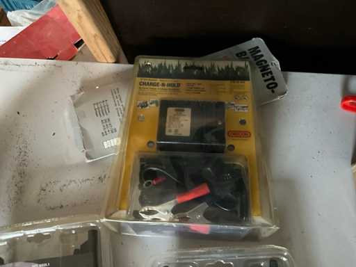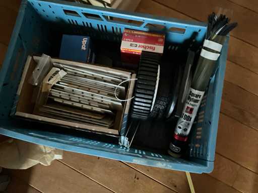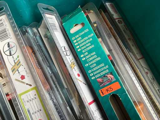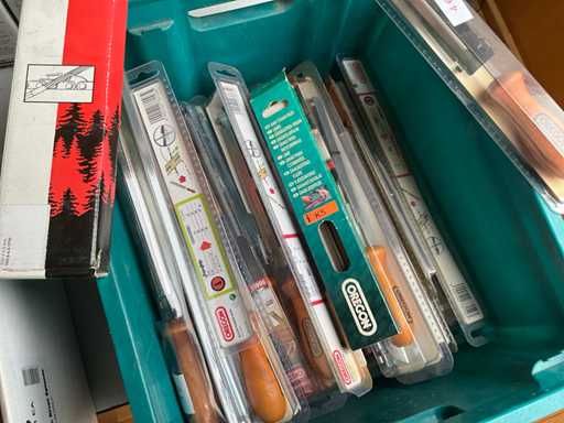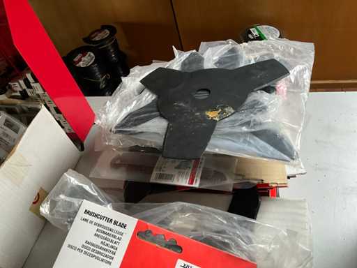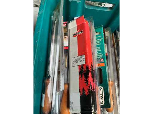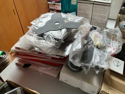 Grote partij diverse accessoires voor kettingzaag waaronder diverse filters, diverse ontstekingskaarsen, diverse maaikoppen en maaikopdraad, kettinzaagstartkoorden, elektrische rivetspinner, elektrische slijper voor kettingen, diverse profielmessen LEITZ, batterijoplader, opzetspiegels voor caravan, kettingontmantelapparaat, afgifte volgens aanwijzing