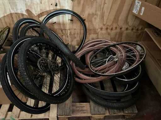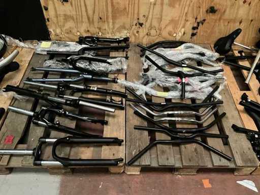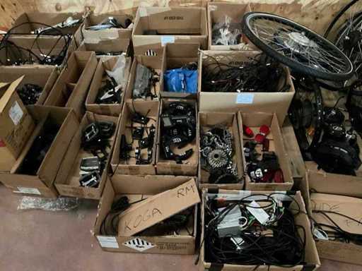Bestaand uit 8x pallet met inhoud bestaande uit voor en achterwielen (met en zonder motor), midden electromotoren, buitenbanden, bagagerekken, sloten-trappers-lichten en reflectoren-Shimano versnellingsschakelaren-kettingbeschermers-stuurstangen en voorvorken enz…
