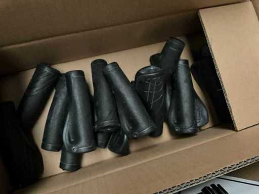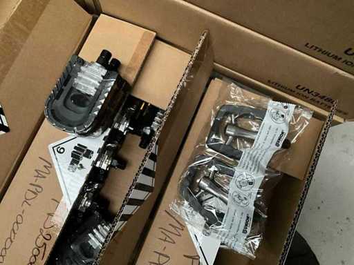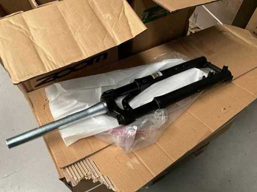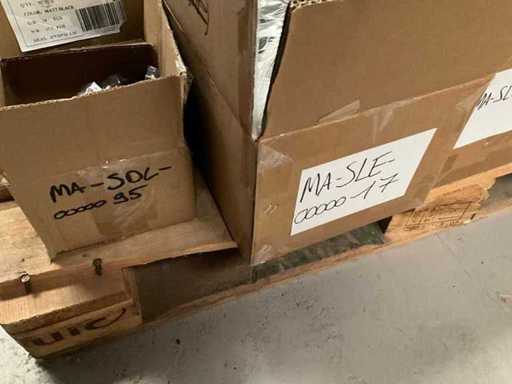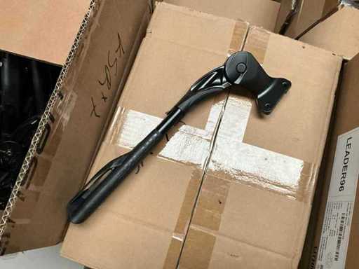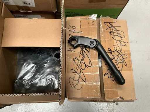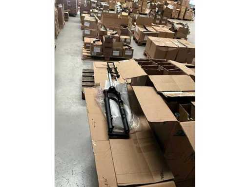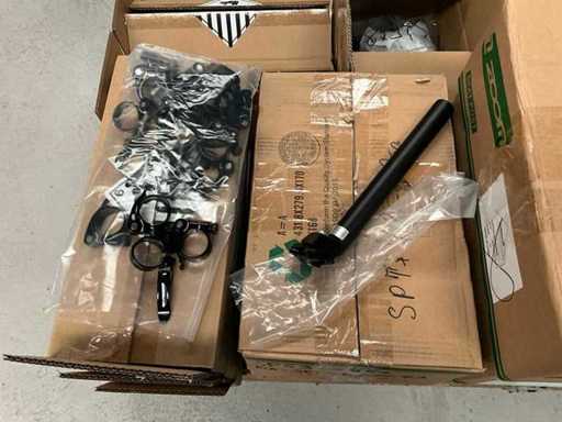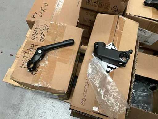 Bestaand uit 6x pallet met inhoud bestaande uit handvaten voor stuur, trappers, 7x karton trapstangen, connectoren, zadelstangen, versnellingsschakelaars, spatborden, parkeersteunen, tandwielen, voorvorken, enz…