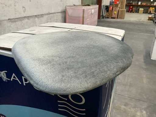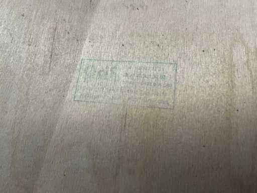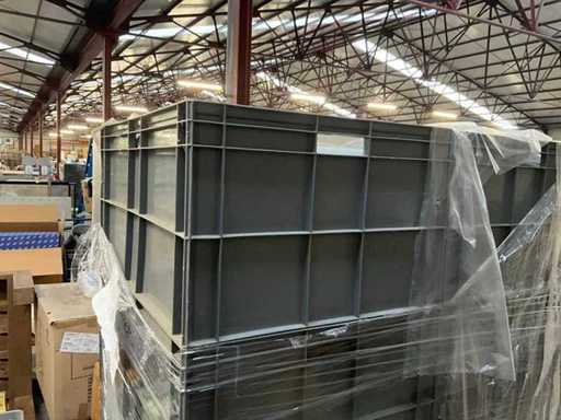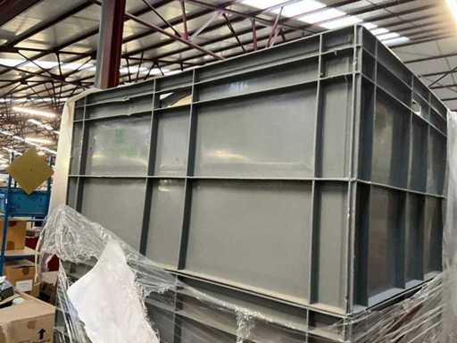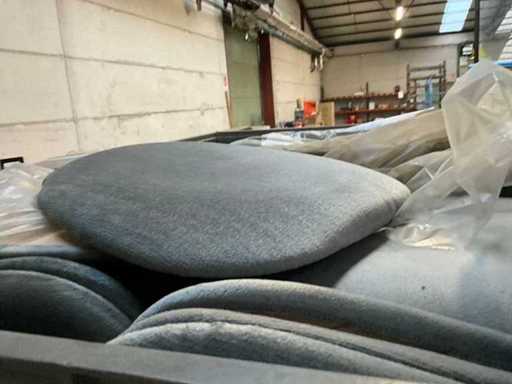 Elke opberg/stapelbak met afmeting 80 x 60 x 40 cm hoog, compleet met inhoud zijnde partij diverse houten stoelzitjes met stoffen bekleding CDS.