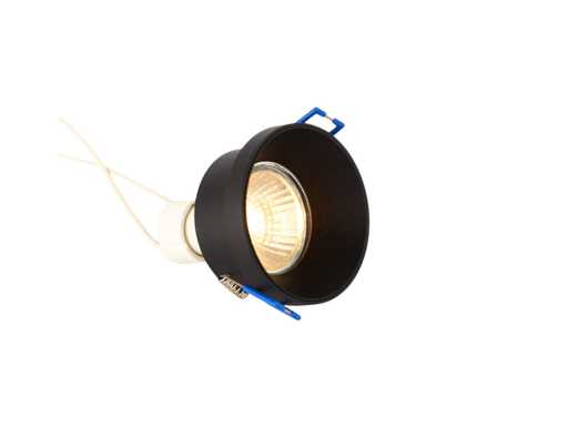 afdichting IP20, product kleur zand zwart, afm. Ø 73 x 42mm, inbouwdiameter ø 63mm, materiaal aluminium, fitting GU10, inclusief keramiek lamphouder, lichtbron bulb niet inclusief, geschikt voor binnen, een bulb invoer, voltage 220-240V, SKU 00842 SKU353