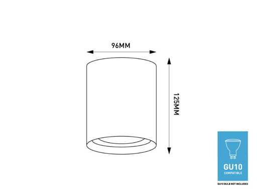 afdichting IP20, product kleur zand zwart, afm. Ø 96 x 125mm, bevestiging inclusief, materiaal aluminium, fitting GU10, bulb niet inbegrepen, geschikt voor binnen, een bulb invoer, voltage 220-240V, SKU 00329