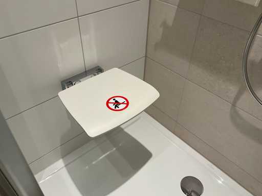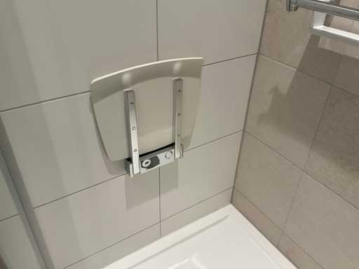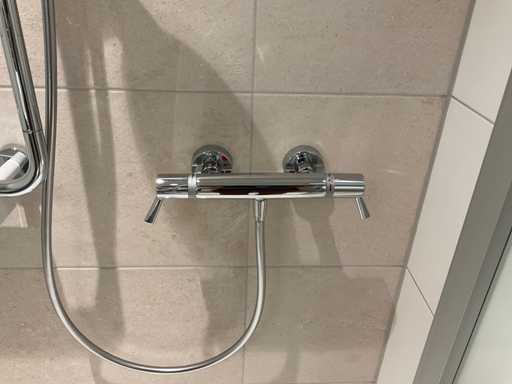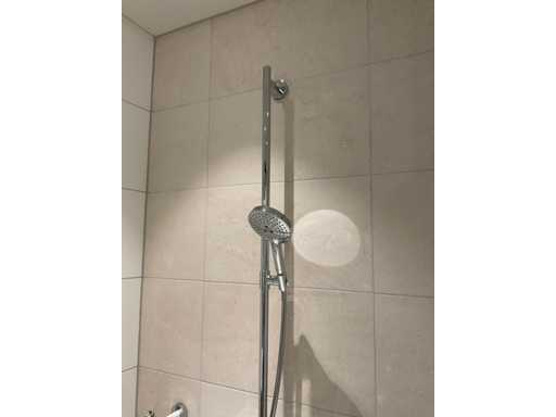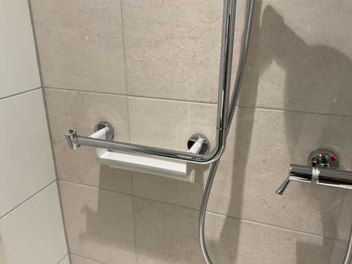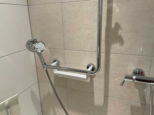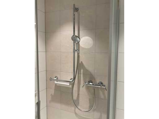 met temperatuurbeveiliging; glijstang met bocht en 2 handdouchehouders; handdouche; planchet en een douchestoel; LET OP: door koper zelf ter plaatse nog te demonteren; zonder de getoonde accessoires