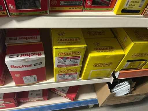 Verschillende schroeven, nagels,plafondankers, anker mungo, BAT hoek, maxispeedy BAT, pluggen duwpower, stalen nagels, schiekijzers en gyprocvijzen.