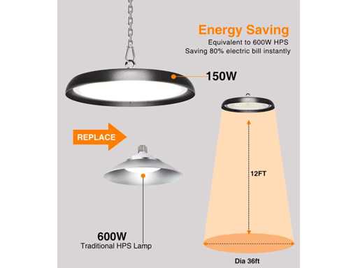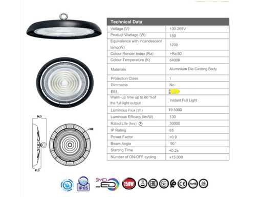 50 x Highbay LED SLIM 150W – 6500K Cool White – Waterdichte UFO – Vermogen: 150W – Lichtstroom: 19.500 lumen – Kleurtemperatuur: 6.500K (koud wit) – IP-waarde: IP65 (dicht) – Inclusief DOB IC driver – Beamingshoek: 90° – Kleurweergave-index (IRC): >80 – Vermogensfactor: >0,95 – Spanning: 100-265V – Materialen: aluminium en PC – Afmetingen: Ø 290 x 70 mm – Kleur: zwart – Levensduur: 30 000 uur – Garantie: 2 jaar – Montageset niet inbegrepen.