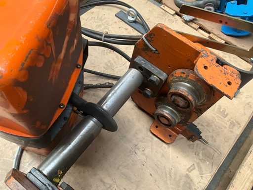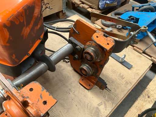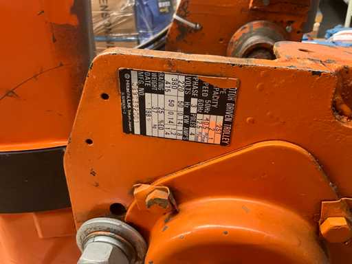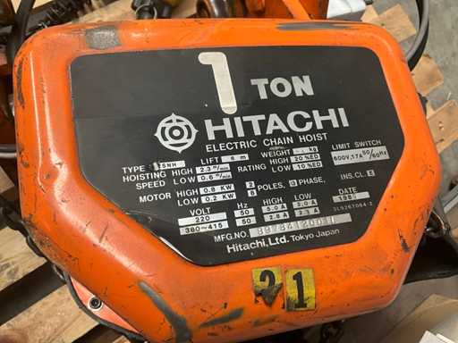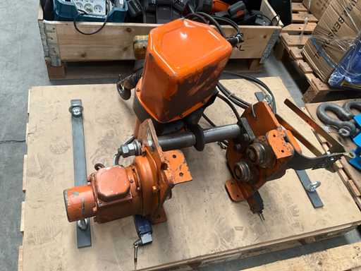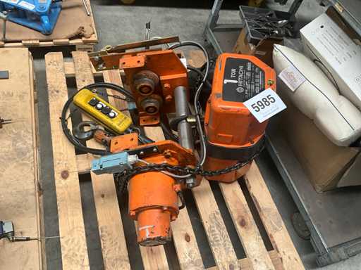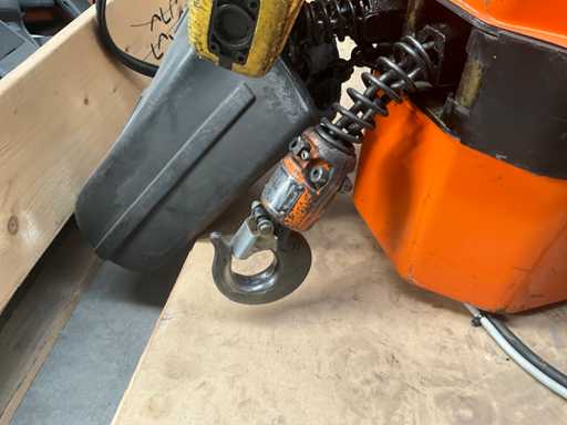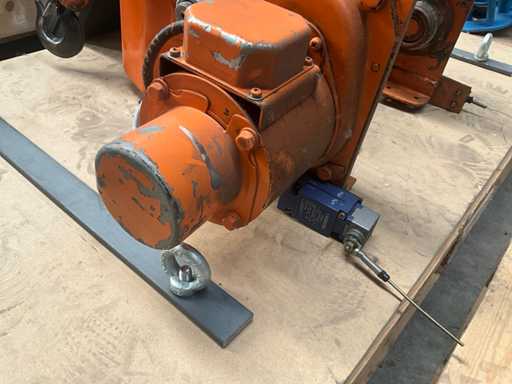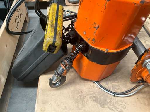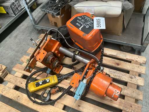 Voorzien van afstandsbediening en op metalen constructie gemonteerd, eventueel voor rollenbaan en ketting voorzien van haak.