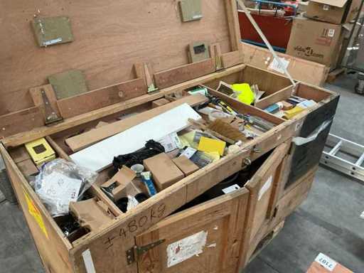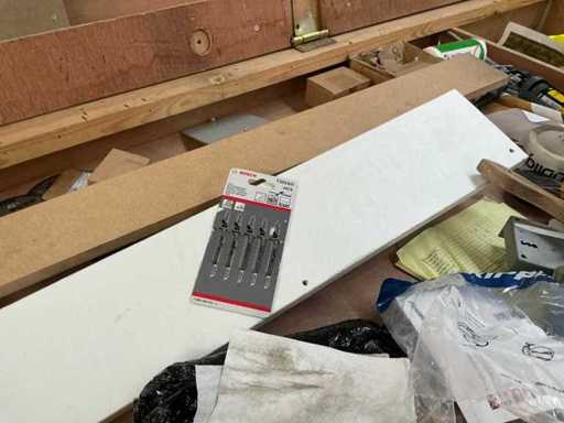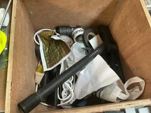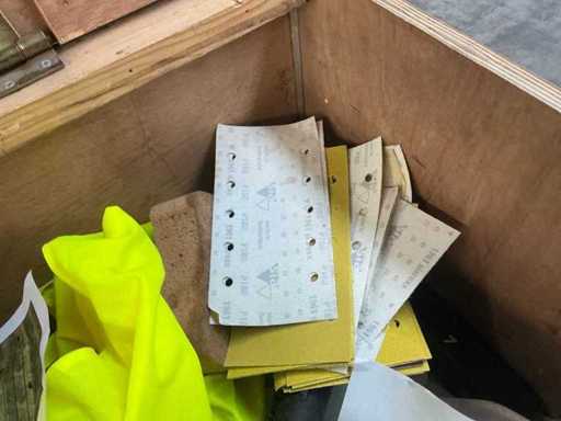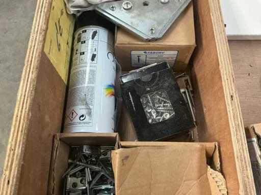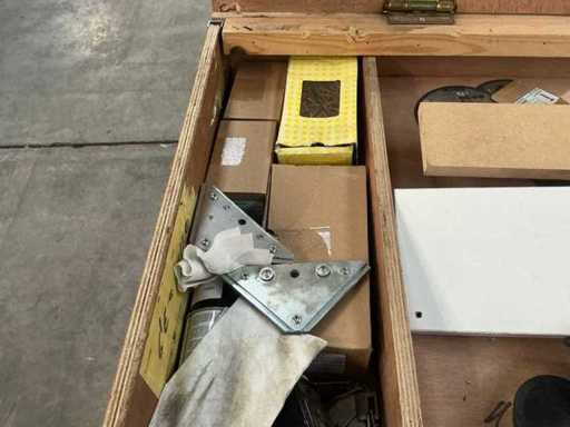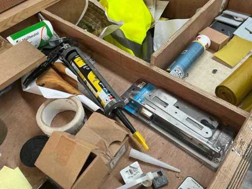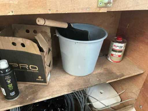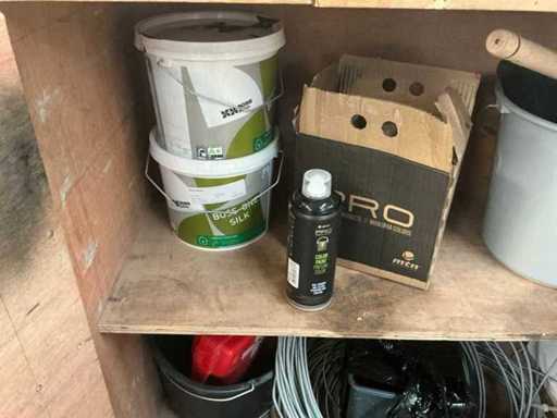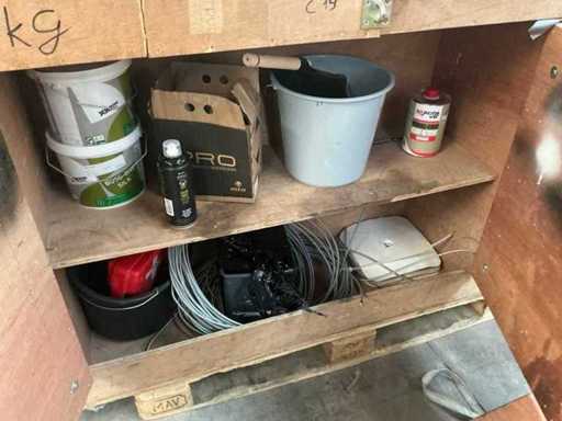 Vooraien van 2x 2 deuren en opklapbaar werkblad, Compleet met inhoud zijnde diverse schroeven Fabory en PGB, divers schuurpapier, Borenset Stroxx, enig deurbeslag, stofzuigertoebehoren, 4 spuitbussen lak MTN Pro, draadtrekkoord, enige emmers