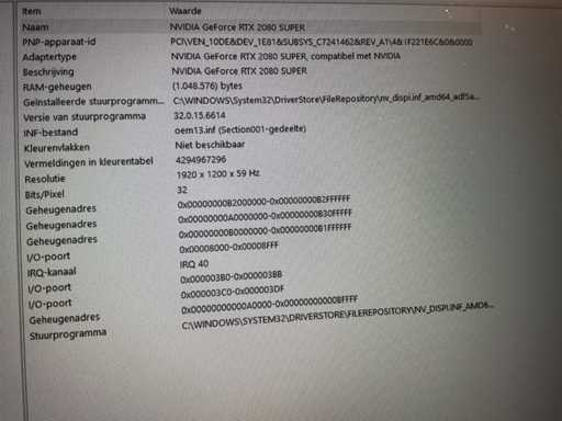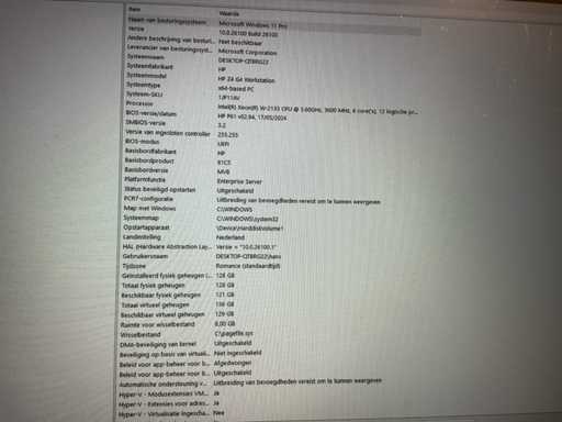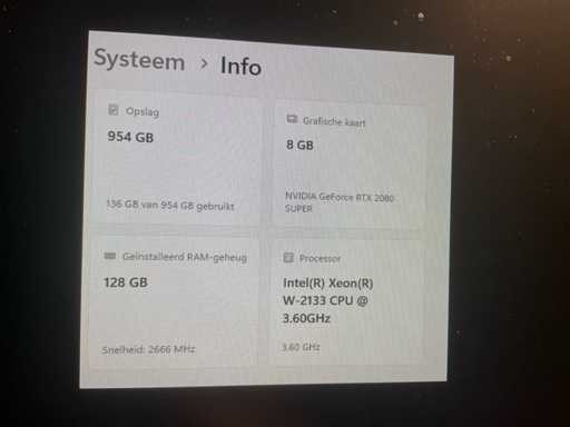 Processor : Intel Xeon W-2133 (3.6GHZ), 128 Gb RAM, GRAFISCHE KAART : Nvidia Geforce RTX 2080 Super ( 8Gb), opslag 1 Tb SSD kaart. Zie bijgevoegde foto’s.