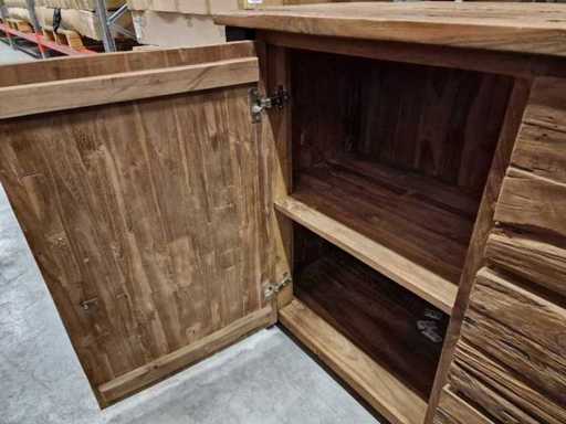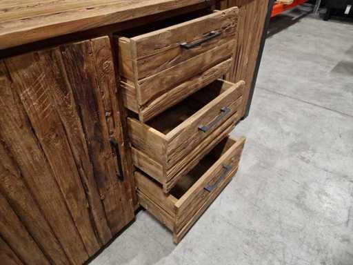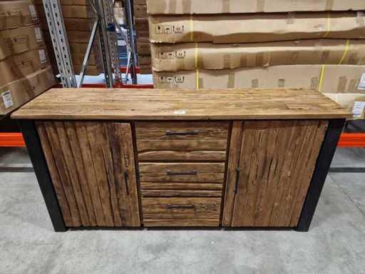 HSM Teak Dressoir Atlanta Vintage met 2 Deuren en 3 Laden - Frame in Zwart Metaal 170 x 50 x H85cm - Ruwe afwerking