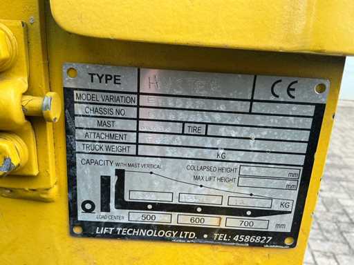 Voorzien van: accu-lader, duplex mast, 1500Kg hefvermogen, verstelbare stuurkolom, volrubber banden, totale breedte 1075 mm, hoogte 2205mm, spanning