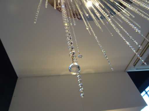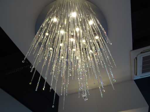 kleur: chromen plaat; aantal lichtbronnen: 15; voorzien van Swarovski kristal, kavel hangt op circa 3 meter hoogte; afmeting: 110 x 100 cm (hxdia)