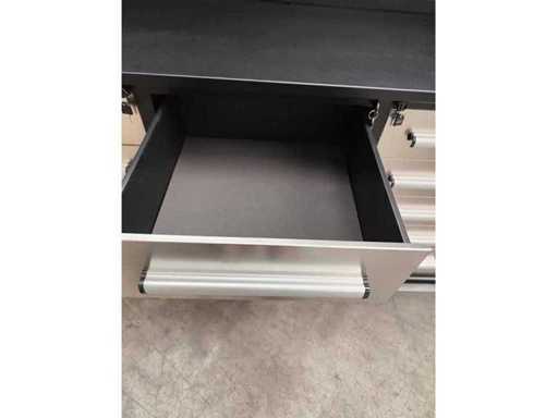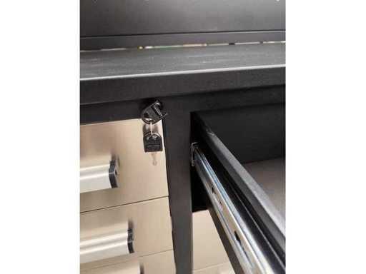 nieuwe ongebruikte werkbank met 41 laden en 2 kasten, antislipmat in de laden, wielen, alle laden van het onderste deel kunnen op slot, inox voorzijde, zijgrepen,