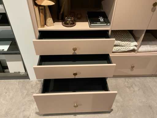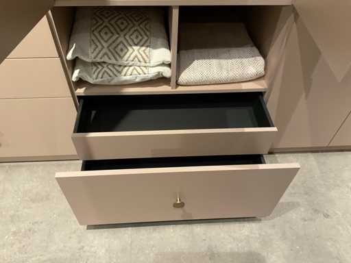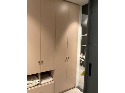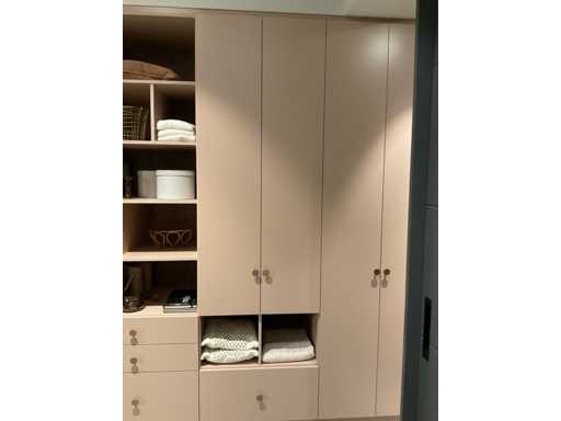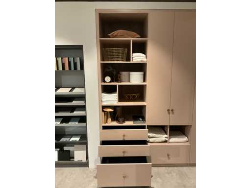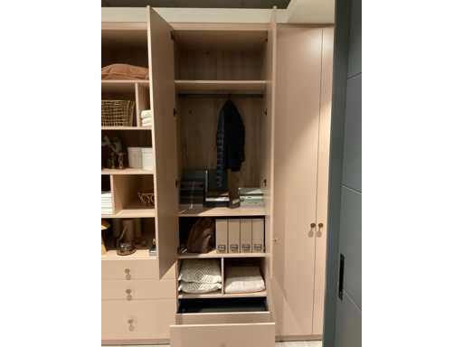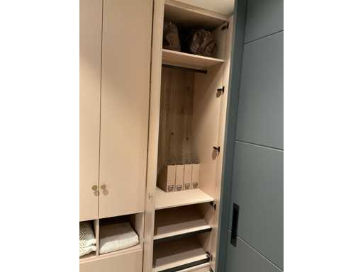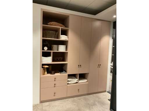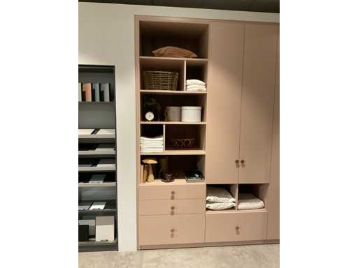 bestaand uit 3 secties waarvan 2 secties hang-legkast; 1 sectie ladenkast met open vakken; LET OP: door koper zelf ter plaatse nog te demonteren; zonder de getoonde accessoires