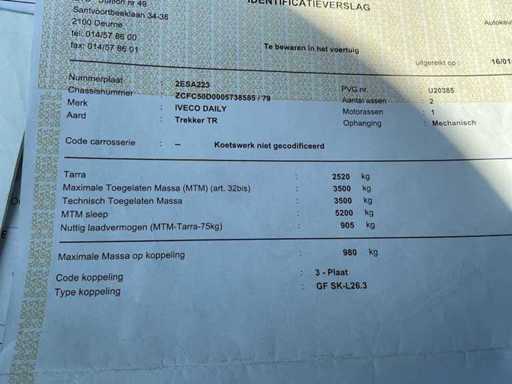 Bestaat uit: Iveco Daily 50C18 Trekker (TR) – Dubbele Cabine – Luchtvering – 3.5ton, uitgevoerd met schotel (5e wiel), aanvullende trekhaakconstructie en luchtvering op de achteras, trekker (TR), motorvermogen: 130 kW (ca. 176 pk), cilinderinhoud: 3.0 liter diesel, transmissie: handgeschakeld, atum eerste inschrijving: 22-05-2008, achteras: luchtbalgen (luchtvering), tarra: 2.520 kg, maximaal toegelaten massa (MTM): 3.500 kg, technisch toegelaten massa: 3.500 kg, MTM sleepgewicht: 5.200 kg, nuttig laadvermogen: 905 kg, maximale massa op koppeling: 980 kg, rijdbaar met B-rijbewijs (3.5 ton uitvoering), dubbele cabine (6 zitplaatsen), elektrische ramen, radio / boordcomputer, 12V aansluiting, extra luidsprekers in deurpanelen, schotel (5e wiel) gemonteerd op aluminium platform, zware trekhaak achterzijde, meervoudige elektrische stekkerverbindingen, digitale tachograaf met 2 kaartsleuven.