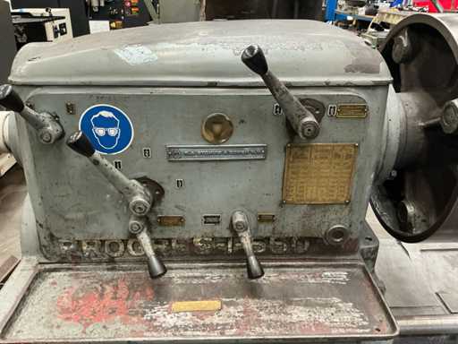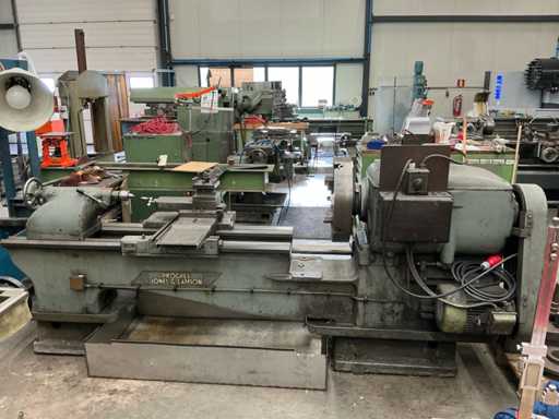 De Jones & Lamson Progress is een zware industriële draaibank uit circa 1955–1970 met een draailengte van 2–3 meter, draaidiameter boven bed van 500–600 mm, draaidiameter boven slede van circa 300 mm, spindelboring van 60–80 mm, toerentalbereik van 20–1.000 rpm via tandwielkast, 3-fase elektromotor van 7,5–11 kW (10–15 pk), mechanische langs- en dwarsvoeding met snelheidsregeling, bedbreedte van circa 400–450 mm en een totaalgewicht van ongeveer 3.500–4.500 kg.