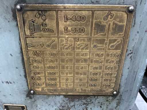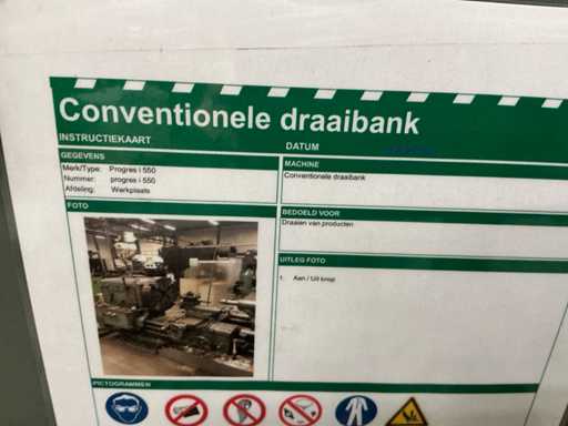 Voorzien van: conventionele draaibank uit circa 1965–1975 met een draaidiameter van 550 mm, afstand tussen centers tot 2 m, 11-1000 rpm via tandwielkast, 7,5 kW motor en ± 2,5 ton gewicht, geïmporteerd door R.S. Stokvis & Zonen N.V.