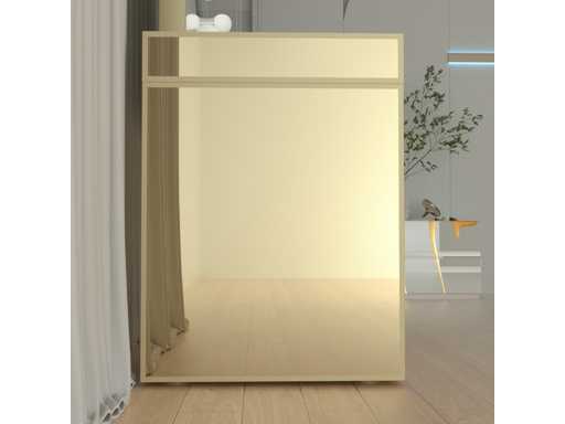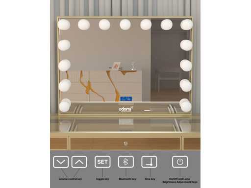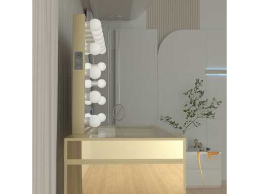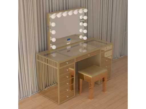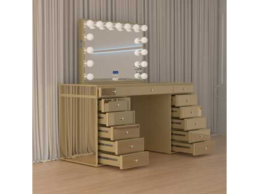 Type: LG010-CG. Model: Kaptafel met spiegel en kruk. Kleur: Hoogglans goud. Verlichting: 15 stuks, 12V. Materiaal: Geverfd MDF, gehard glazen blad. Afmeting: complete set: 1 * Tafel: 1500x600x810mm, 1 * Spiegel: 1000x800mm, 1 * Kruk: 350x400mm. Voorzien van: Verlichting met 3 standen – Touchbuttons – USB en type C aansluitingen – Muziek luisteren via Bluetooth functie - Helder gehard glazen tafelblad – 13 lades.