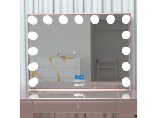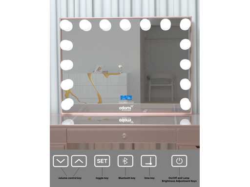 Type: LG02-RG. Model: Kaptafel met spiegel en kruk. Kleur: Roze. Verlichting: 15 stuks, 12V. Materiaal: Geverfd MDF, gehard glazen blad. Afmeting: complete set: 1 * Tafel: 1500x600x810mm, 1 * Spiegel: 1000x800mm, 1 * Kruk: 350x400mm. Voorzien van: Verlichting met 3 standen – Touchbuttons – USB en type C aansluitingen – Muziek luisteren via Bluetooth functie - Helder gehard glazen tafelblad – 13 lades.