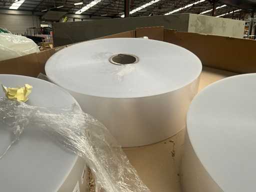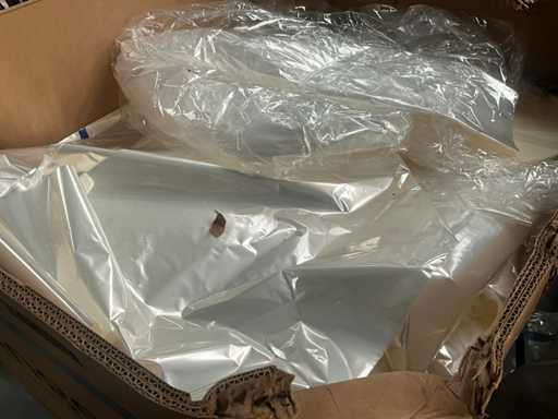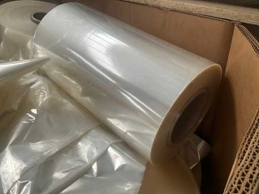 Zijnde 11 kartonnen palletboxen met restanten van plastiek, compleet met diverse rollen plastiek er bovenop waaronder 32/38 micron proctite dwf, 25/40 micron earthfirst.