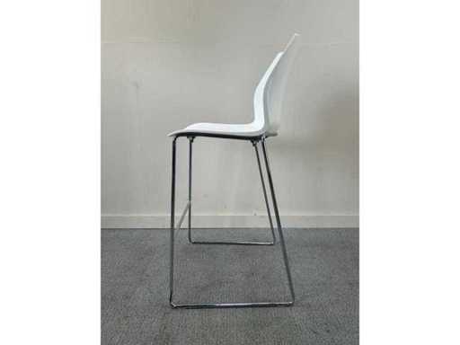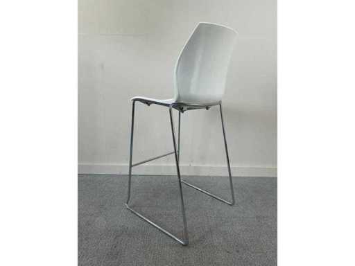 Kalea by Kastel stoel met wit rugpaneel en verchroomd sledepootonderstel. Iets hogere uitvoering, stapelbaar en comfortabel. Praktisch en duurzaam, ideaal voor kantines, vergaderruimtes of hoge tafels.