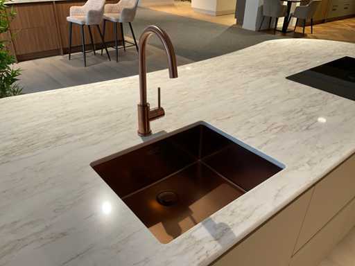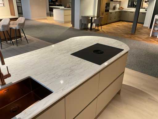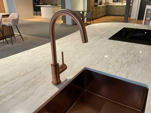 showroommodel; eilandwerkblad met Bora 4-zone inbouw inductie kookplaat met geïntegreerde afzuiging; Reginox vlakinbouw spoelbak coppertone en eengreeps keukenmengkraan coppertone; LET OP: door koper zelf ter plaatse nog te demonteren; zonder de getoonde accessoires