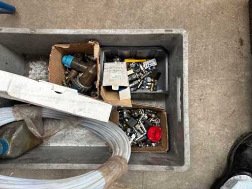 Kist met diverse pneumatische slangen, koppelingen en reduceerventielen