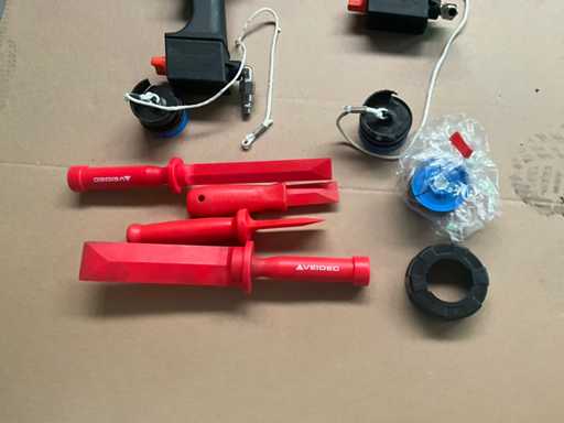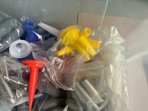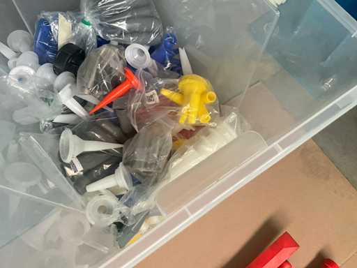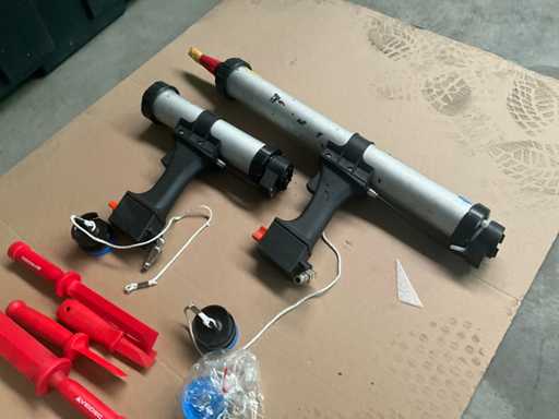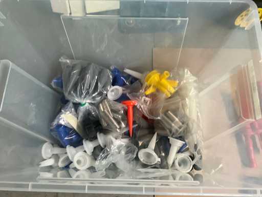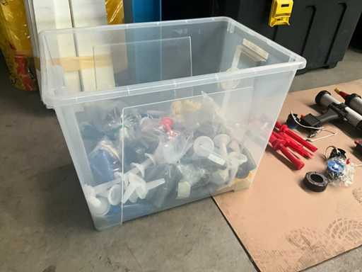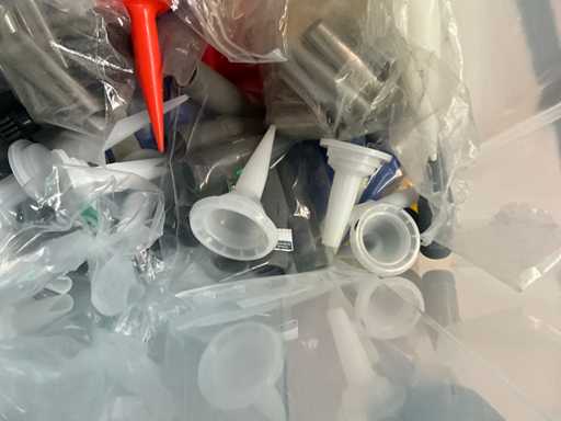 2 diverse kitspuiten met enige afstrijkspanen Veidec en pvc box inhoudende partij diverse pvc spuitkoppen