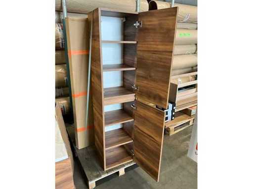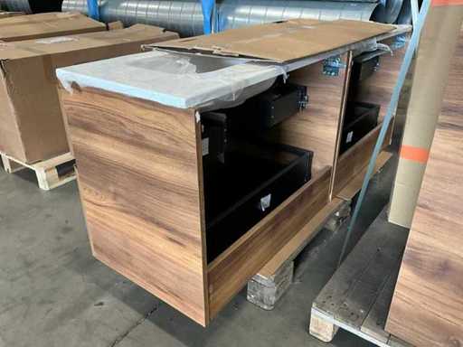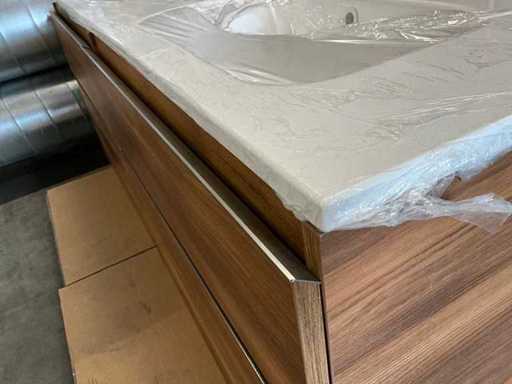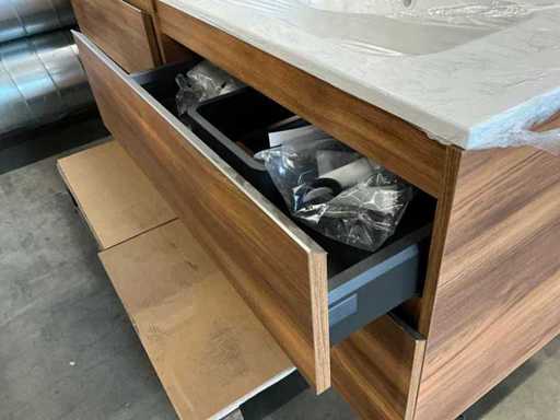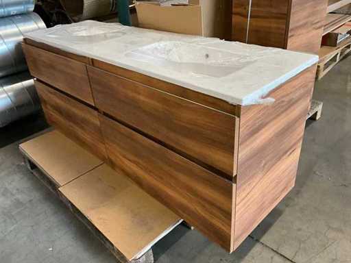 Onderkast voorzien van 4 laden, compleet met composiet dubbele wastafel en kolomkast voorzien van 2 deuren 40 x 36 x 166cm en spiegel 160 x 70cm