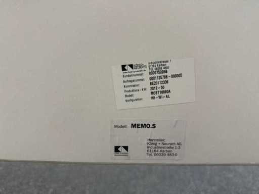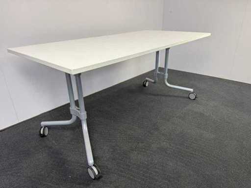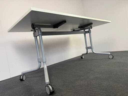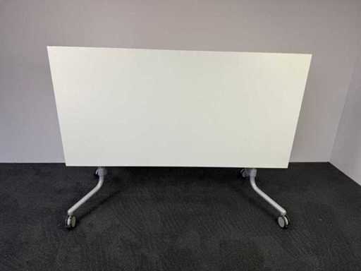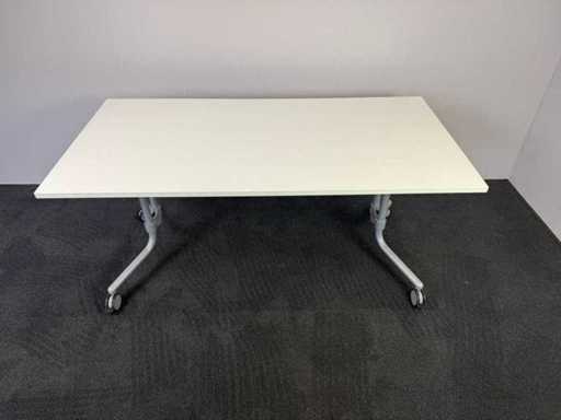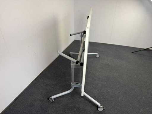 Witte König + Neurath plooitafel op wit metalen vierpoot, uitgerust met wielen voor mobiliteit. Met gebruikssporen.