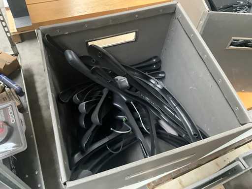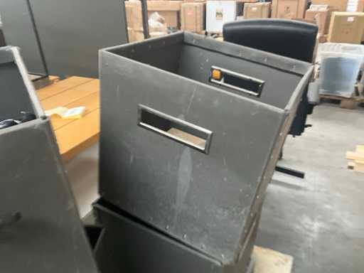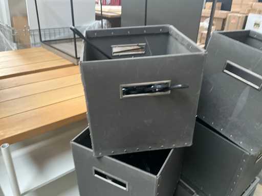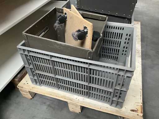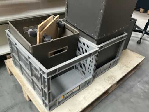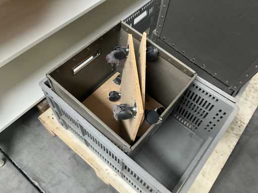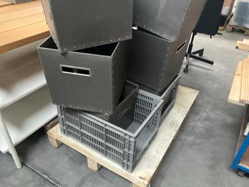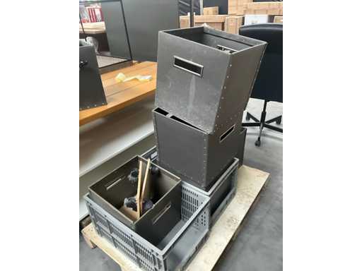 In kunststoffen uitvoering, elk van circa 36 x 36 x 36 cm, voorzien van 2 handvat openingen en waaronder voornamelijk voorzien van verrijdbaar onderstel, compleet met inhoud zijnde partij diverse kapstokken en 2 grijze pvc opbergbakken, elk van circa 60x40 cm en 32 cm hoog en langs 1 korte zijde open.