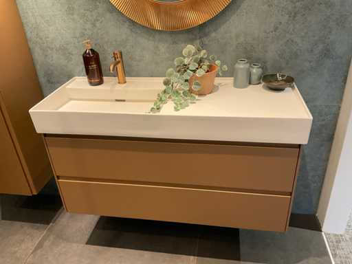 badkamermeubel met wastafelblad; 2 laden; Grohe wastafelmengkraan; kleur geborsteld brons; kolomkast afm. 35x35x165 cm; 1 deur met 4 glazen legplanken; zonder de spiegel en hanglamp; LET OP: door koper zelf ter plaatse nog te demonteren; zonder de getoonde accessoires