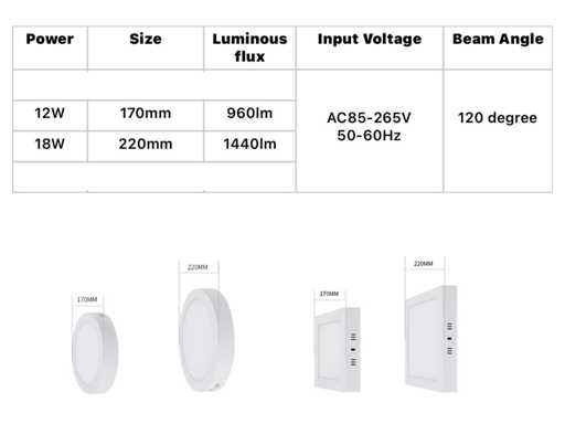 10 x Rond LED-paneel op Oppervlakte – Vermogen: 12W – LED-type: SMD – Kleurtemperatuur: 6500K (koud wit) – Lichtstroom: 960 lumen – Afmetingen: 160 x 28 mm – Spanning: 220-240V (50/60 Hz) – IP20 – Levensduur: 30.000 uur – Beamhoek: 40° – Driver en montageset inbegrepen – Geschikt voor gebruik binnenshuis, ideaal voor kantoren, winkels, gangen en keukens.