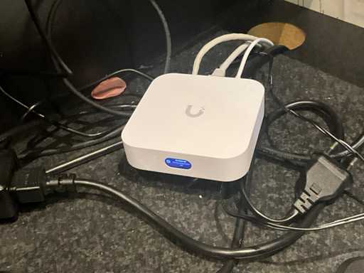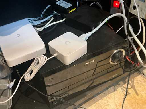 1 multimedia speler Philips voorzien van 3 luidsprekers, 1 router UniFi, 1 access point UniFi en 1 betaalterminal Saturn 1000