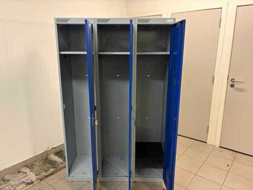 Blauwe metalen locker, 3 mod breed, elk compartiment heeft 1 legger. 2 modules met sleutel, 1 module zonder sleutel