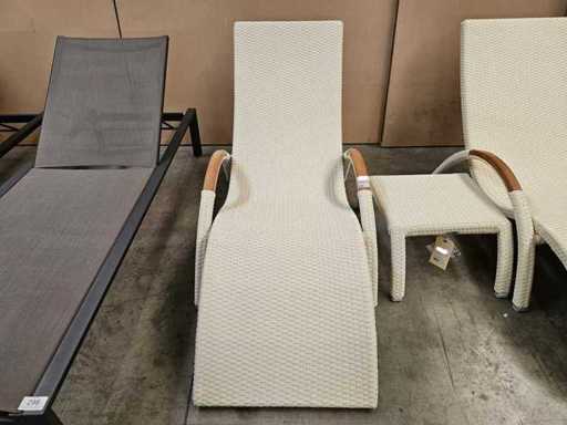 Luxury Lounge Ligbed Wave Wit met Kussen Taupe - Teak Armleuning - Vaste Rugleuning - Alu Frame - HDPE Wicker - Stapelbaar