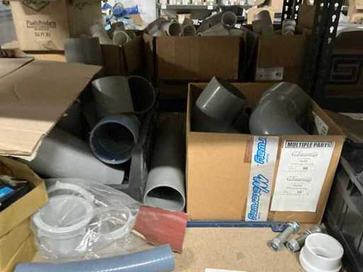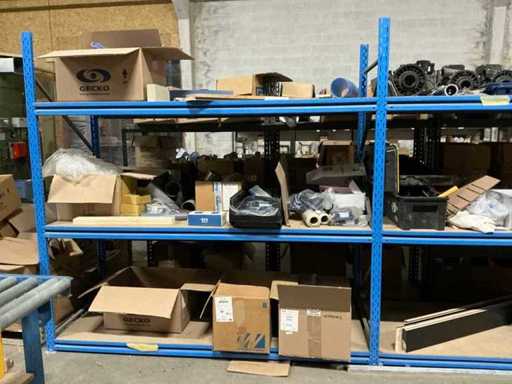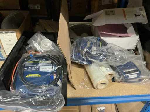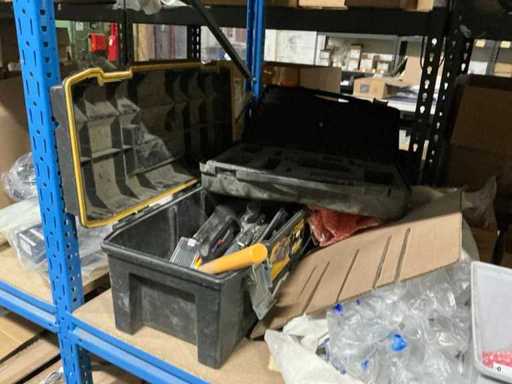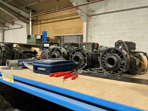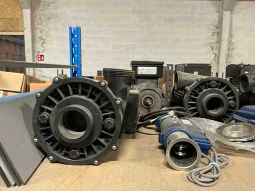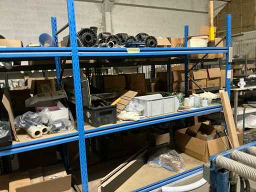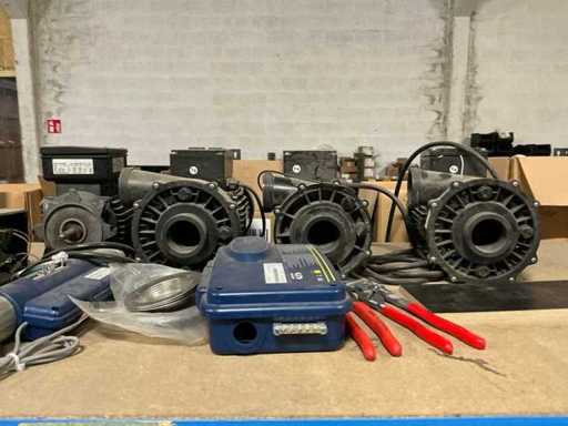 Compleet met inhoud inhoudende partij handgereedschap en bevestigingsmaterialen, controllers, gereedschapskoffer, diverse pvc bochten, spa-generators, transmitters, 5 diverse waterpompen EME, diverse spa-audio modules,…