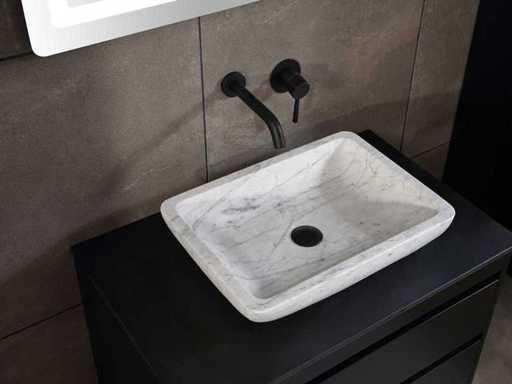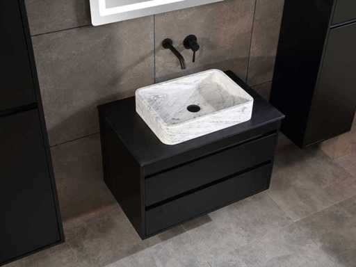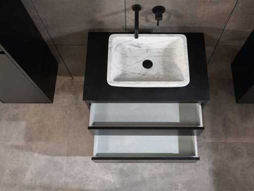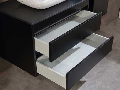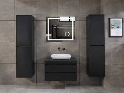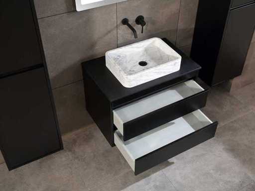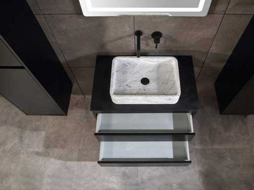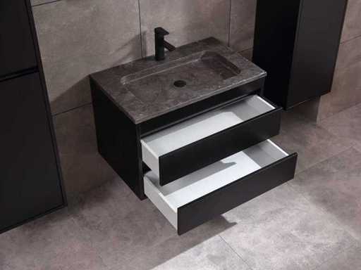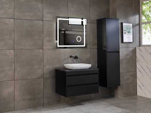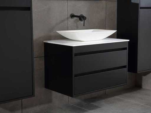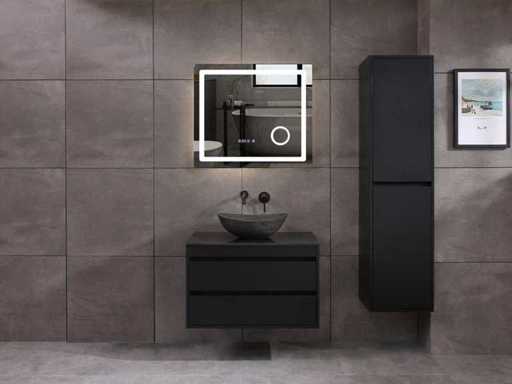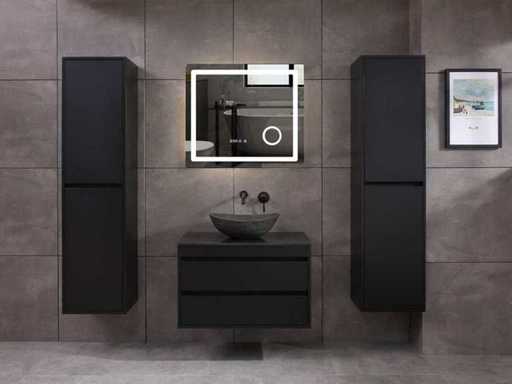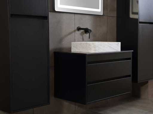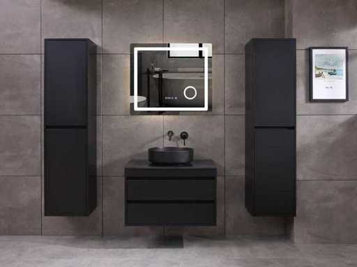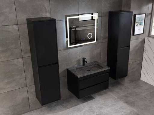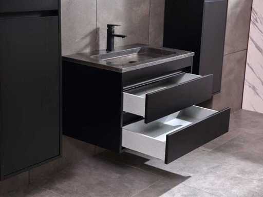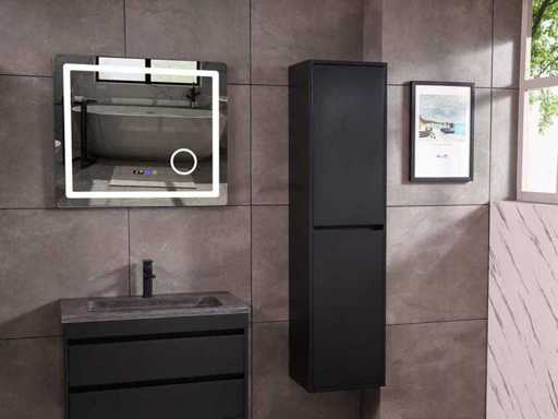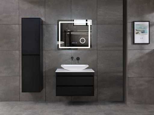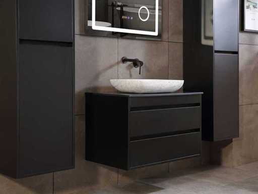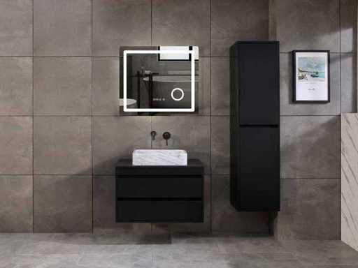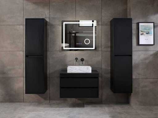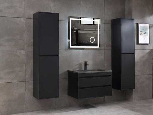Afmeting meubel: bxdxh 80x49x50cm - hangkast 40x35x160cm(let op!!! wordt met 1 hangkast geleverd), Kleur mat zwart, Materiaal 2cm 5-laags multiplex(zeer sterk en vochtbestendig), Hangkast softclose deuren en extra planchets (hangkast is universeel en kan zowel links als rechts naast het meubel gehangen worden), Kranen exclusief, Lades 2 stuks met softclose, Wastafel natuursteen of solid surface (keuze uit diverse modellen van de laatste foto's vaste of losse wasbakken met een mat witte of mat zwarte solid surface top, vaste bakken zijn ook zonder kraangaten beschikbaar zodat u een muurkraan kunt gebruiken! keuze graag aangeven per email op info@mawialux.nl, Spiegel ledspiegel met 3 kleuren ledverlichting(3000/4500/6000K led-dioden)/vergrootglas/verwarming(anti condens)/klok met touchscreen (mag ook voor een ronde spiegel geruild worden indien gewenst of tegen een kleine meerprijs een luxe variant met display, bluetooth en speakers, neem daarvoor contact met ons op voor een passende aanbieding op info@mawialux.nl), Afvoeren exclusief , Conditie: Nieuw in doos, Bijzonderheden 2 jaar garantie, compleet met installatiekit, mat zwarte aluminium grepen achter de inkepingen van de lades en deuren, natuursteen wastafel is behandeld met coating, zeer hoge kwaliteit, Extra's de hangkast mag geruild worden voor een kraan en afvoerset naar keus(graag aangeven per email op info@mawialux.nl) of als u een extra hangkast nodig heeft kunt u ons ook mailen voor een passende aanbieding