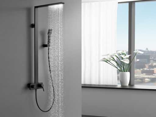 Hoofddouche welke is geïntegreerd, handdouche en een watervaluitloop.