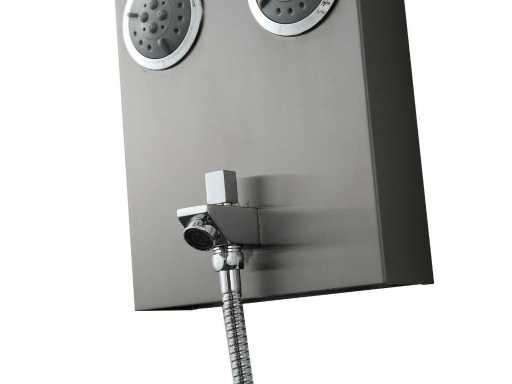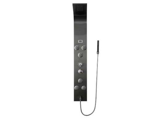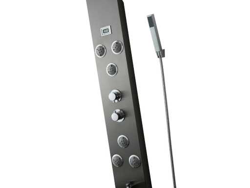 materiaal 304 rvs (messing kraanwerk), kleur zwart met chrome, hoogte 155x20 cm, binnenwerk keramisch, douchekop geïntegreerd, handdouche verstelbaar met doucheslang, voorzien van display met digitale temperatuuraanduiding, 6 verstelbare massagejets met meerder waterfuncties, anti kalk behandeld