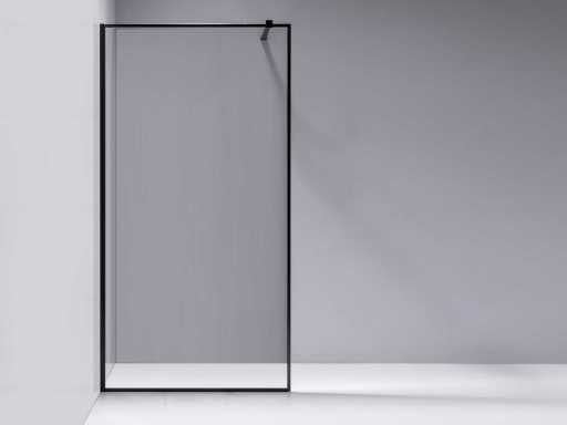 kleur mat zwart met mat zwart frame rondom glas, materiaal aluminium profiel met messing ophanging (mat zwart), glas 8mm dik helder nano gecoat veiligheidsglas (vermindert kalkaanslag doordat het water niet op het opervlak kan hechten), voorzien van onzichtbare schroefbevestiging - extra hoek verstevigingsblok voor vloer (mat zwart, compleet met bevestiging materiaal - inclusief mat zwarte waterstrip voor vloer onder de wand - vierkante mat zwarte bevestiging stang van messing 120cm (in te korten naar gewenste maat), wandprofiel 20 mm verstelbaar