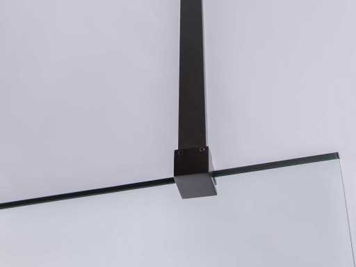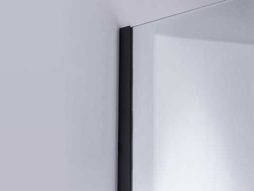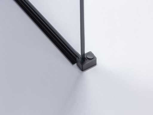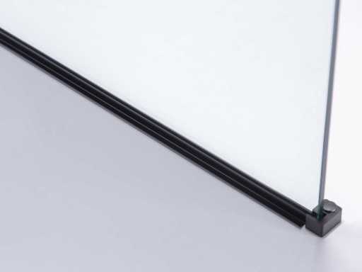 kleur mat zwart frame met helder glas, materiaal aluminium profiel met messing ophanging (mat zwart), glas 8mm dik helder nano gecoat veiligheidsglas (vermindert kalkaanslag doordat het water niet op het opervlak kan hechten), voorzien van onzichtbare schroefbevestiging - extra hoek verstevigingsblok voor vloer (mat zwart, compleet met bevestiging materiaal - inclusief mat zwarte waterstrip voor vloer onder de wand - vierkante mat zwarte bevestiging stang van messing 120cm (in te korten naar gewenste maat), wandprofiel 20 mm verstelbaar
