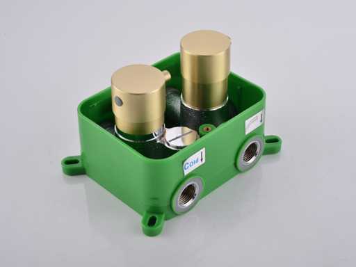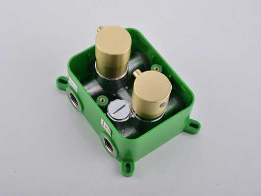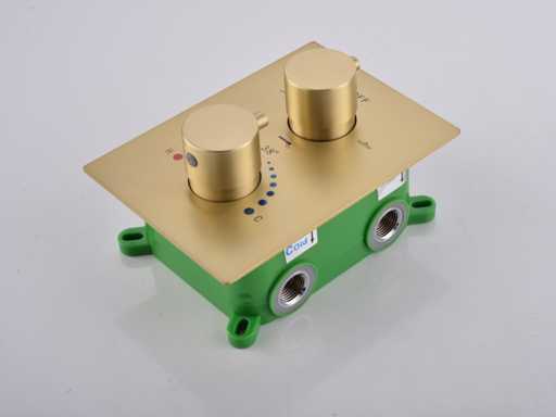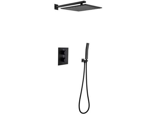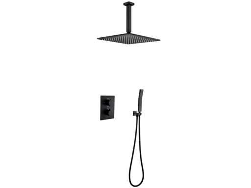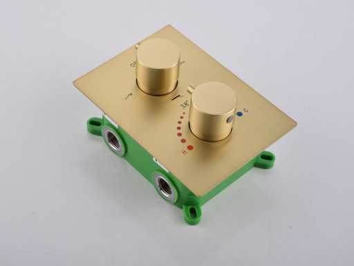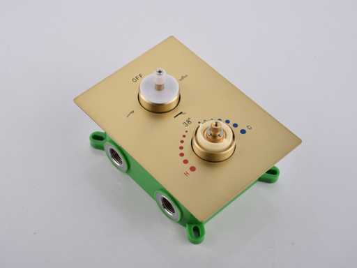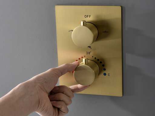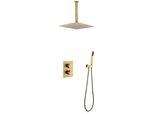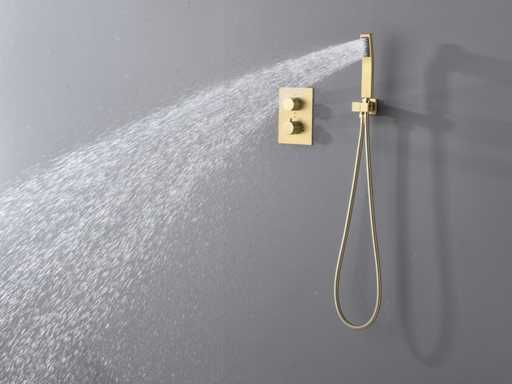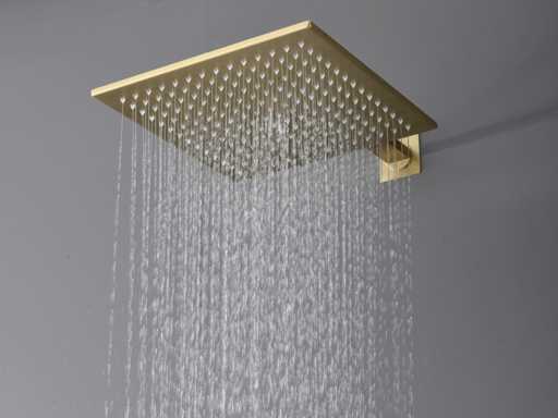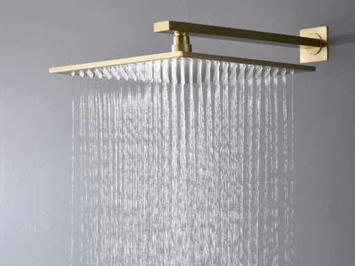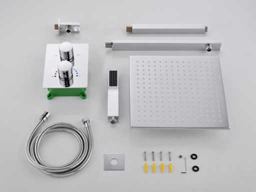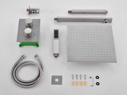 keuze uit diverse kleuren: geborsteld goud, chroom, geborsteld RVS of mat zwart(kleurkeuze graag aangeven op de afhaaldag) materiaal messing , smart control thermostaatkraan, binnenwerk keramisch, douchekop 30x30 cm, handdouche verstelbaar met doucheslang en ophanging van messing, voorzien van badkraanuitloop, douchekop met kunststof wateruitlopen om gemakkelijk kalkaanslag te verwijderen, douchekop kantel en draaibaar, inclusief inbouwbox voor eenvoudige installatie, set wordt geleverd met zowel een muurstang als een plafond stang