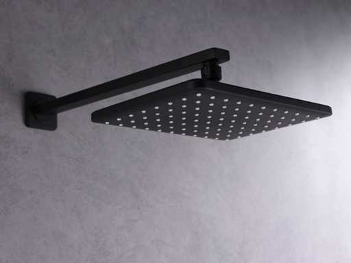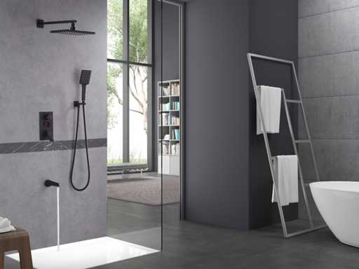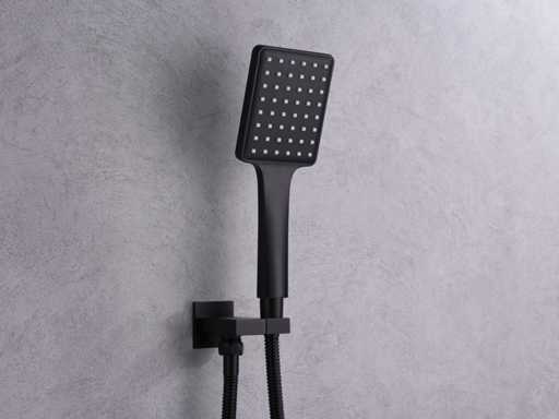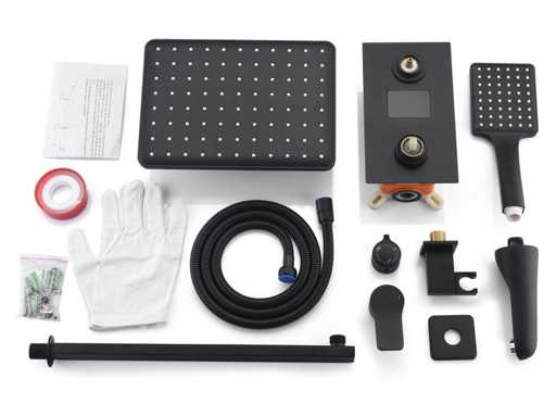 materiaal messing en 304 rvs, kleur mat zwart, mengkraan, binnenwerk keramisch, douchekop 20x20cm, handdouche verstelbaar met doucheslang en ophanging van messing, douchekop met kunststof wateruitlopen, douchekop kantel en draaibaar, voorzien van digitale micromotor aansturing door middel van waterflow, geen stroom nodig, temperatuur digitaal afleesbaar, digitale aanduiding tijdsduur, anti kalk behandeld, messing muurplaat, met inbouwbox voor makkelijke installatie