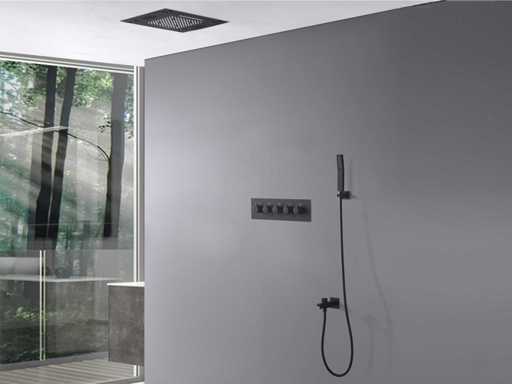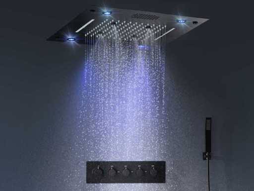 inbouw regendouche met radio en ledverlichting, Materiaal messing en 304 rvs, Kraan smart control thermostaatkraan met 4 regelknoppen (houd de temperatuur altijd constant), Binnenwerk keramisch, Douchekop 40x40 cm met 3 functies uit 304 rvs en 4 stuks ledverlichting, Handdouche verstelbaar met doucheslang en messing ophanging, Voorzien van ingebouwde bluetooth met 2 speakers, douchekop met 3 functies regendouche met 2 watervallen en 4 stuks vernevelaars, badkraan uitloop, 4 stuks ledverlichting met instelbare kleuren welke bedienbaar zijn met de meegeleverde afstandsbediening, kunststof wateruitlopen om gemakkelijk kalkaanslag te verwijderen, keramisch binnenwerk goed voor 800.000 keer open/dicht zonder lekkage, plaatdikte: 12 UM, werkdruk: 2-16kgf/cm2, werking temperatuur: 0 tot 90 graden Celsius, anti kalk behandeld, Conditie: Nieuw, Bijzonderheden 2 jaar garantie, hoge kwaliteit, alle water functies kunnen allemaal tegelijk of onafzondelijk gebruikt/geregeld worden