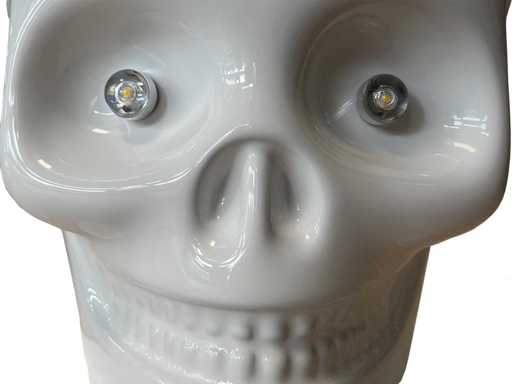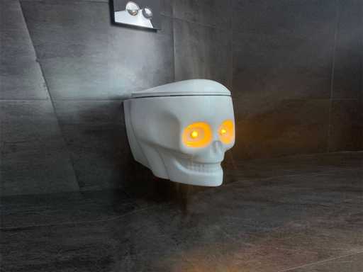 type doodskop, afmetingen lxbxh 53,5x39x35cm, materiaal keramiek en kunststof, kleur glans wit, toiletbril softclose met deksel, afvoer p-trap, gewicht 30 kg, toilet is gegoten en geglazuurd en later in in de oven verhard waardoor deze zeer krasbestendig is, 2x ledverlichting in de ogen verwerkt welke op een bewegingssensor op batterijen werkt, exclusief 4xaaa batterijen), tornado rimless flushing systeem (geen spoelrand), compleet geleverd met bevestigings materiaal, universeel toepasbaar op ieder inbouwreservoir, quick release deksel