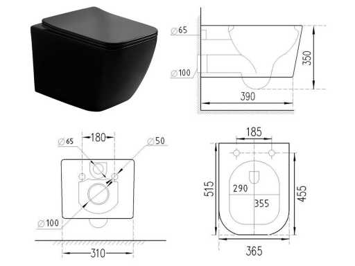 kleurkeuze mat zwart of mat wit, afmetingen lxbxh 52x36x38cm, materiaal keramiek en kunststof, toiletbril softclose met deksel, afvoer p-trap, gewicht 30 kg, robuuste kwaliteit, toilet is gegoten en geglazuurd en later in in de oven verhard waardoor deze zeer krasbestendig is, rimless flushing (geen spoelrand), compleet geleverd met bevestigings materiaal, universeel toepasbaar op ieder inbouwreservoir, quick release deksel