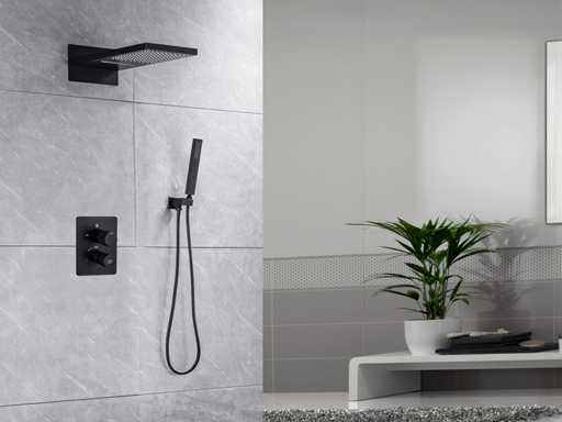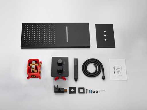 kleurkeuze in 3 kleuren: Mat zwart of gunmetal grey(kleurkeuze op afhaaldag aangeven), materiaal messing en 304 rvs, mengkraan, binnenwerk keramisch, douchekop L55xB23cm, handdouche verstelbaar met doucheslang en ophanging van messing, douchekop met 2 waterfuncties (waterval en regendouche) met kunststof wateruitlopen, voorzien van digitale micromotor aansturing door middel van waterflow, geen stroom nodig, temperatuur digitaal afleesbaar, digitale aanduiding tijdsduur, anti kalk behandeld, messing muurplaat, met inbouwbox voor makkelijke installatie, dit betreft een nieuw product in verpakking