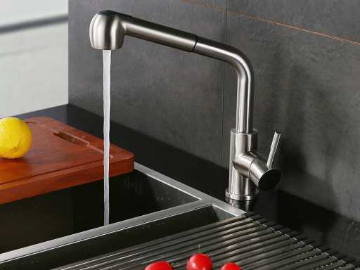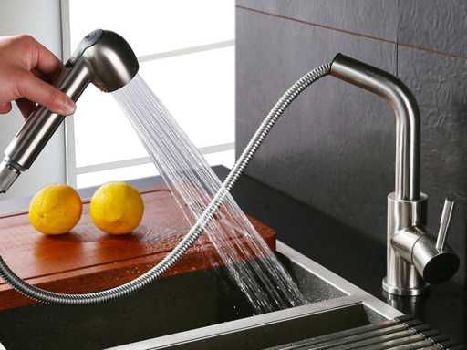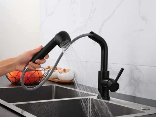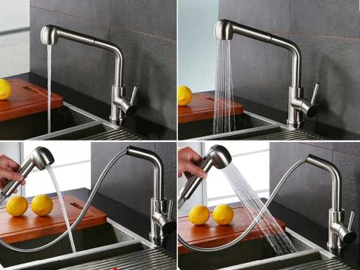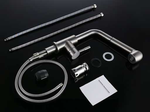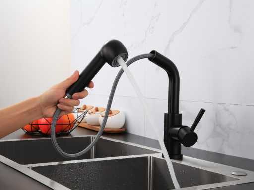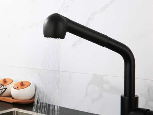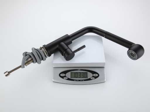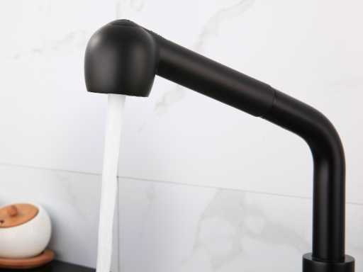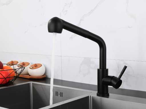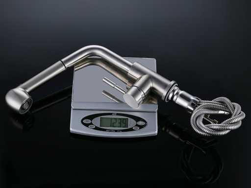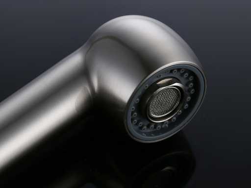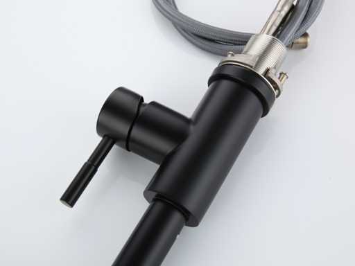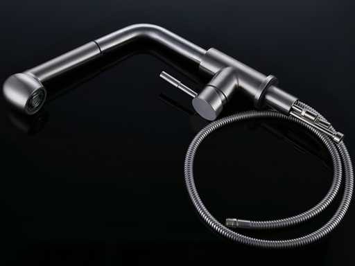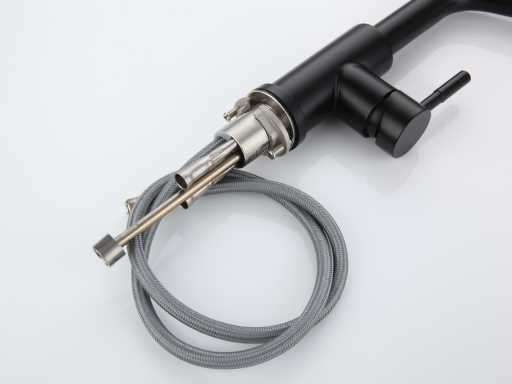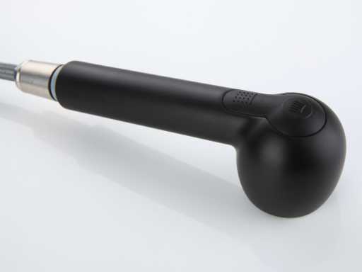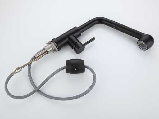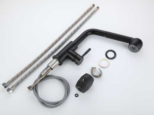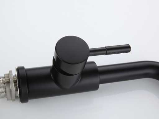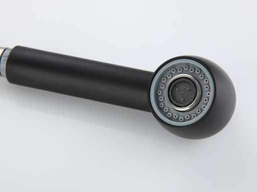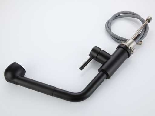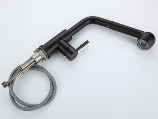 Kleurkeuze geborsteld RVS of Mat zwart (keuze graag aangeven op de afhaaldag) materiaal 304 rvs, hoogte circa 31 cm, gewicht 2kg, voorzien van sproeikop met 2 functies, uitloop 360 graden draaibaar, waterslangen met aansluitmateriaal, sproeikop uitneembaar met extra lange flexibele waterslang